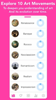 Our app covers several key art movements in chapters giving you a comprehensive understanding of art history. You’ll study the most famous paintings of Impressionism, Realism, Renaissance, Baroque, Romanticism, and Rococo art movements. You'll learn about the different styles, techniques, and themes that have defined art throughout history and understand the contexts that inspired the world's greatest artists.