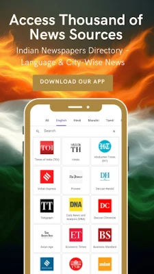 Search any Indian newspaper, magazine, or news portal directly by name, region, or language using the built-in smart filter.