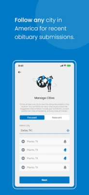 There are two obituary feeds within The Obituary App. Users can save multiple cities in either feed in the menu section labeled “Manage Cities”. Users must follow at least one city in a feed to populate obituaries.