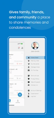 A feed consists of Obituary cards, similar to a drivers license; An obit card consists of the decedent's name, photo and age (if available), the city in which the death took place, and multiple functions for the user. A user can express condolences, send flowers through the funeral home website, view the full obituary, share through email or social media, save to one's own personal memory wall, indicate an intention of attending the funeral or memorial service, or report the obituary for misinformation.