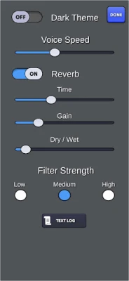 Other features in this app include a Text Log, to review the text messages that have come through during your session. A dark theme to have your screen not be so bright. Reverb audio effect. Voice speed to slow or speed up the voice.
